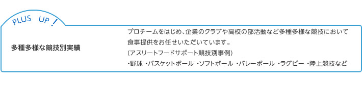 競技に勝つ体づくりには、食のマネジメントが必要不可欠です。当社はさまざまな競技の食事管理で培ったノウハウを活かし、競技特性に合わせたメニュー作成や、栄養情報媒体の提示、セミナーなど、トータルな栄養サポートを行っています。また、選手が常に最大限のパフォーマンスを発揮してもらえるよう、チームスタッフ様とも連携をとって対応しています。